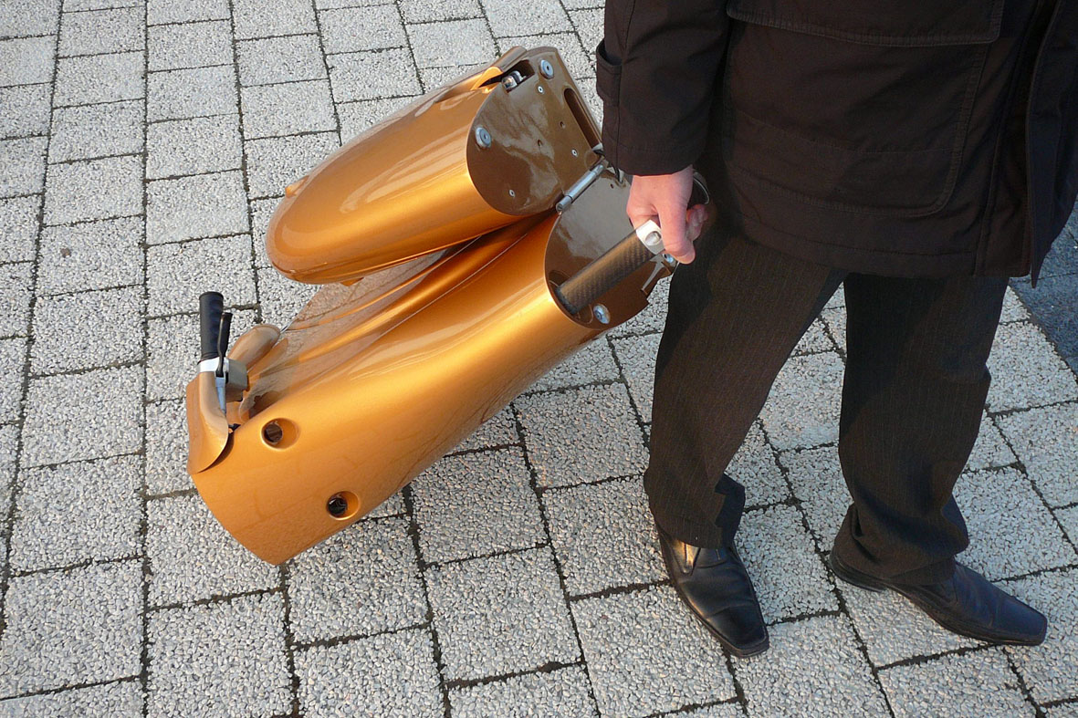 Scooter elétrico é algo que você já viu antes. Agora, um scooter elétrico que vira uma maleta é realmente uma coisa que não se vê todo dia. Essa é a proposta do Moveo, o exótico – pra dizer o mínimo – projeto do grupo húngaro Antro, formado pelas empresas Antro Nonprofit Ltd, Solo-Duo Co. e Moveo Co., ambas focadas em desenvolver soluções de transporte urbano que não impactem o meio-ambiente. De acordo com a fabricante, o scooter foi desenhado com “formas orgânicas”, pesa cerca de 25 kg e tem autonomia para 35 km, rodando a uma velocidade média de 45 km/h. O diferencial é que ele pode ser dobrado, ficando com as mesmas proporções de uma mala de viagem e podendo ser carregado como tal.